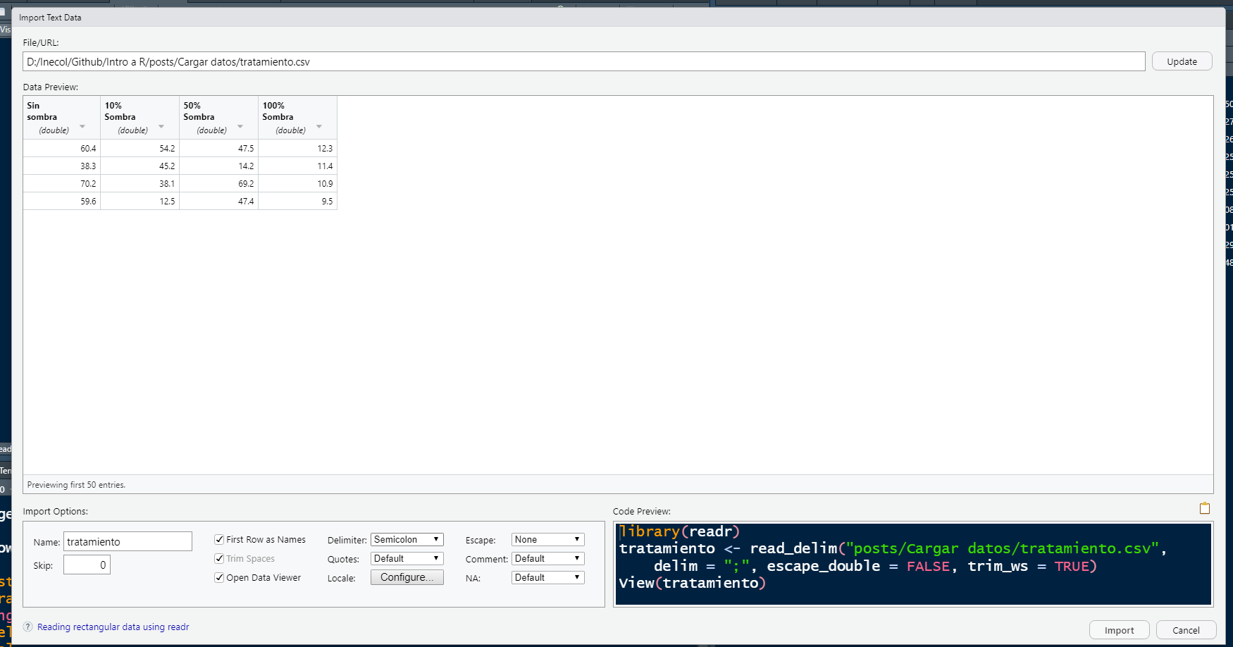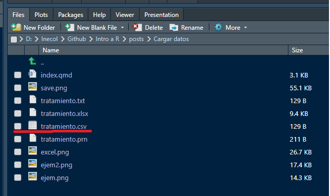 Las nuevas versiones de RStudio tienen una manera muy manual e interactiva de cargar archivos. Para usarla tenemos que instalar el paquete readr install.packages("readr"). Una vez instalados vamos a ir a la pestaña de archivos (files) en la parte interior derecha (generalmente) de RStudio. Ahora damos click en el archivo de tratamiento.csv