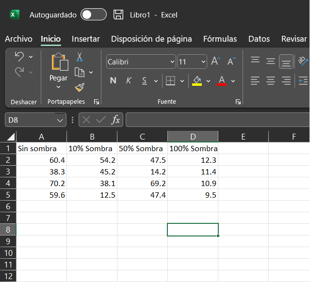 Vamos a pasar la base a excel. Es tan sencillo como digitar todo en excel o copiar y pegar. Lo único importante es recordar que en R cada columna es una variable o en este caso, un tratamiento. Por lo tanto la base debería verse así: