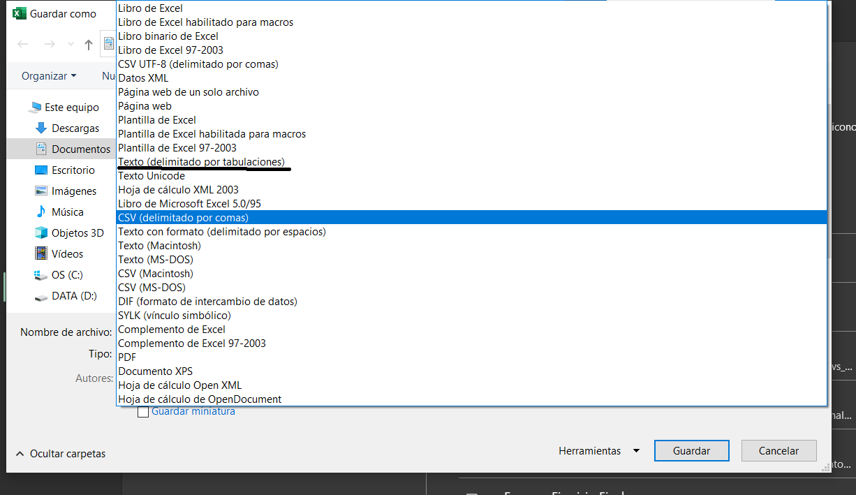 Ahora vamos a guardar el archivo, pero lo vamos a guardar con una extensión determinada. Ya saben la ruta-> archivo -> Guardar como. Aquí tenemos dos opciones principales el .csv (comma separated values) separado por comas o .txt (text file format) delimitado por tabulaciones. Ambos son formatos mucho menos pesado que un libro de Excel y por lo tanto más sencillos de leer para R.