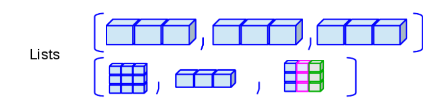 Las listas como los vectores son de una sola dimensión. Sin embargo, pueden tener diferentes tipos de valores e incluso de elementos. Una lista puede tener dentro un vector, una matriz, un data frame e incluso otra lista